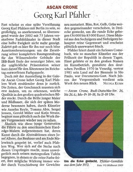 Doch mit der Ausstellung in der Galerie Ascan Crone kehrt Georg Karl Pfahlers Werk strahlender denn je zurück. Die Zeiten, der Geschmack mussten sich erst ändern, um zu erkennen, welche Qualität in den großen quadratischen Bilder steckt. Durch die Brille junger Maler und Bildhauer, die sich der späten Moderne besonnen haben, durch Künstler wie Anselm Reyle, Tomma Abts, Sergej Jensen, Gerold Miller und Katja Strunz, beginnt man plötzlich auch das Werk dieses Vergessenen wieder neu zu sehen.
